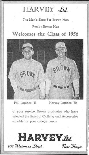Hillhouse Ltd. and Harvey Ltd. operated as Brown’s campus haberdashers — independent shops that stocked the “Ivy” wardrobe. Harvey in particular was run by Brown students and alumni and explicitly marketed itself as Brown’s Ivy store; longtime proprietor Harvey Lapides later described the shop as “like a club” centered on the Ivy look. Harvey Lapides ’50 was a World War II Navy veteran and professional baseball player from Barrington, RI. He co-founded Harvey Ltd. with his brother Philip. Strasmich, a sports editor, described Lapides as the greatest athlete of the class in his column from October 1945. “[Harvey] Lapides was a third baseman and captain of the team in 1943 and 1944,” Matthew Longcore wrote in a blog post published on Ivy Style. He would play in the 1943, 1944 and 1947 seasons, and his college batting average of .347 would make him a record holding hitter for over 50 years. Upon graduation, he signed with the Yankees. Philip Lapides played for the Bristol Owls, a Class B team in the short-lived Colonial league. He played 51 games and batted .301 for the pennant and championship-winning 1949 Owls before a back injury forced a career change.” While at Brown, Harvey even played against former President George H.W. Bush when he was at Yale.
