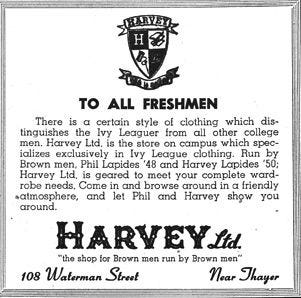 In January 1950, Harvey Ltd was born at 108 Waterman Street, and flyers were distributed targeting freshmen first. It had a motto, voici le meilleur (the best is here), and had no shortage of demand. Alongside the usual holidays, students established a tradition of shopping at Harveys at the start of their freshman year and during rush week. It became an integral step towards initiation into the Brunonian identity.