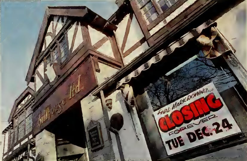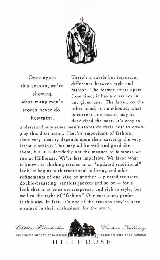 Hillhouse was founded by Marty Roses in Providence, 1939, and closed its doors in 1996. Roses was a traveling salesman for Rogers Peet of New York, but had a special fondness for Providence. He set up shop originally at the corner of Brook and Waterman before moving to 135 Thayer Street. A 1996 issue of the Brown Alumni Magazine fondly recalled its aesthetic: “The shop was a study in understated elegance: brass chandeliers, a spinning wheel, and, beneath an upstairs balcony, a papier-mache ceiling imported from France.” Former owner Bob Singer emphasized the shop’s timelessness amidst lots of changes on College Hill. “Returning alumni thought we were the one constant at Brown,” he said. They used to sell handwoven ties with the crest or Bruno the bear embroidered upon it.